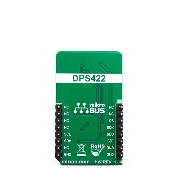 Pressure 9 Click is a digital barometric air pressure sensor Click board™. It is equipped with the DPS422, barometric air pressure sensor, based on a capacitive sensor element. Besides the pressure, this sensor can also measure temperature. Measurement data is available over the I2C or SPI interface, along with the factory calibrated coefficients, used for high-accuracy data conversion. The device also features 32 words-long FIFO buffer, low power consumption, and very high precision, thanks to an integrated 24-bit A/D converter. It can be used within the pressure range from 300 to 1200hPa and temperature in the range from -40⁰C to +85⁰C.