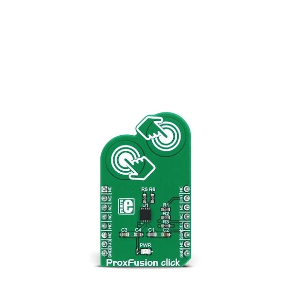 The integrated circuit, used on ProxFusion Click, allows a minimal number of external components, thus allowing the ProxFusion Click to work with a very low power consumption. The compact size and advanced onboard functions make this Click an ideal solution for implementing all kinds of advanced HMI interfaces, wearable devices, proximity activated or dimmed TFT backlight, digital angle gauges, and similar applications that include any kind of capacitive proximity/touch and Hall-effect sensing elements.