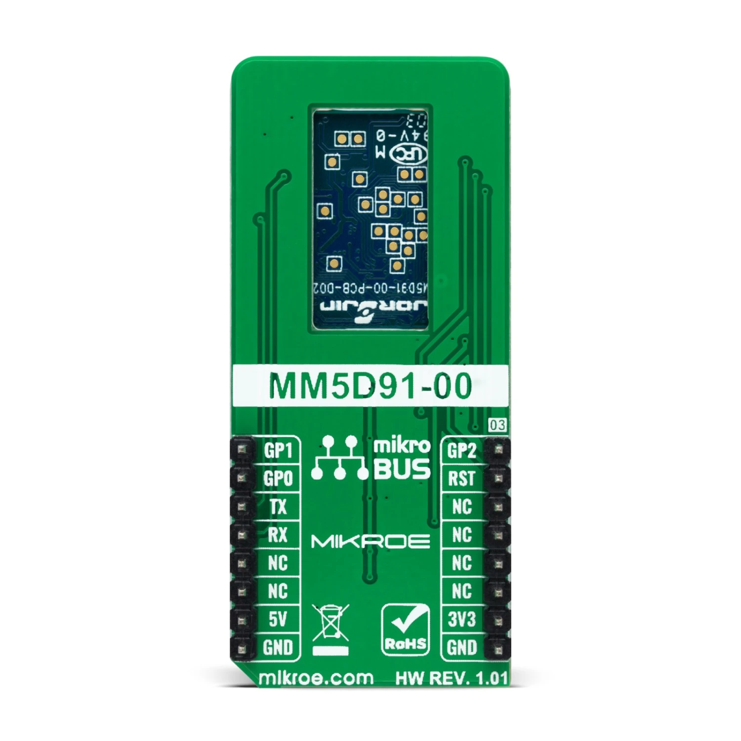 Radar Click is a compact add-on board that uses short-wavelength electromagnetic waves, which objects in their path reflect, providing information on these objects’ range, velocity, and angle. This board features the MM5D91-00, a presence detection sensor module that integrates 60GHz mmWave technology that counts the number of people entering or exiting an entrance from Jorjin Technologies Inc. It includes the ARM Cortex-M4F based processor system, 1Tx, 3Rx antenna, and integrated regulator, alongside azimuth and elevation field of view of ±45° and ±40°. Its detection goes up to 10m for macro and 5m for micro motion with environmental-factors immunity such as temperature, wind, sunlight, and dust. This Click board™ is suitable for various presence sensing applications, from office and home to commercial buildings and more.