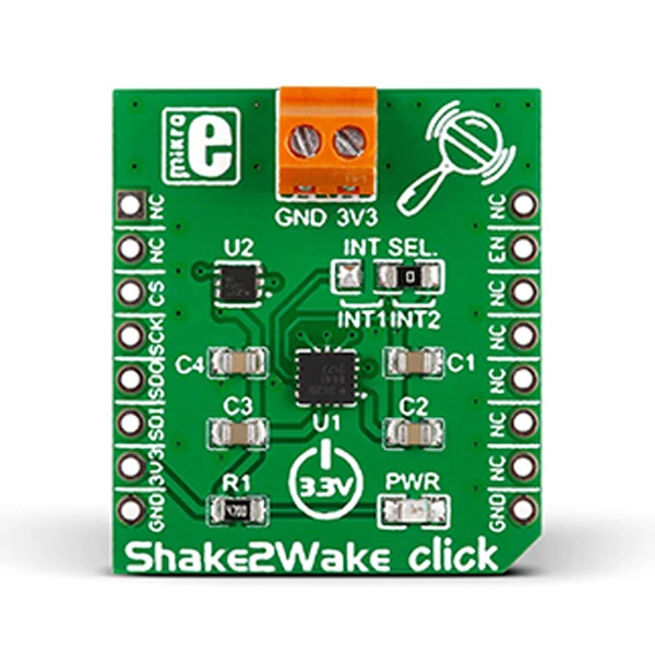 Shake2Wake Click carries an ADXL362 ultralow power, 3-axis MEMS accelerometer and ADP195 the load switch which provides power domain isolation, both of them manufactured by Analog Devices. The distinguishing feature of this IC is that it incorporates several activity detection modes. The interrupt pins from the chip are connected to an onboard ADP195 power switch IC that in turn controls an external device connected through a screw terminal. The detection threshold is configurable (both intensity and duration). The duration of inactivity that leads to switching off is also programmable. Shake2Wake Click can also be used as a regular accelerometer, for continuous sensing, in which case it communicates with the target MCU through mikroBUS SPI interface. Uses 3.3V power supply only.