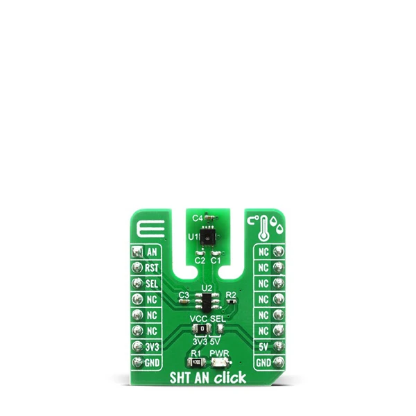 SHT AN Click is a sensorics based add on board which can be used for measuring humidity and temperature. It features fully calibrated, linearized and temperature compensated SHT31-ARP-B sensor with analog output. This sensor is built on a new technology CMOSens® sensor chip from Sensirion. What differentiate this Click board™ comparing to other is dual sensor analog output which can be used for measuring and calculation of the data over one analog output. This board is best suitable for the smart and low power applications which require temperature range of -40 to up to 90 °C. We have also in our offer SHT Click, which is a digital interface version of the same sensor.