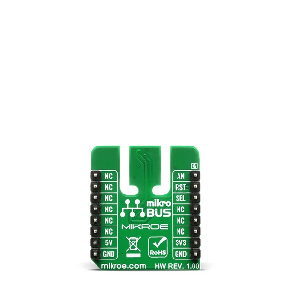 This Click board™ can be supplied and interfaced with both 3.3V and 5V without the need for any external components. The onboard SMD jumper labeled as VCC SEL allows voltage selection for interfacing with both 3.3V and 5V microcontrollers.