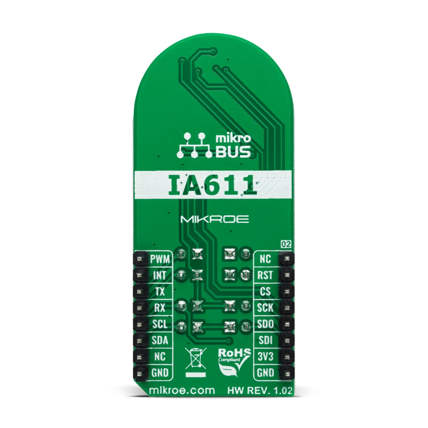The IA611 does not require a specific Power-Up sequence but requires a voltage of 1.8V for its supply and logic part to work correctly. Therefore, a small regulating LDO is used, the TC1015, providing a 1.8V out of 3.3V mikroBUS™ power rail, alongside Enable feature through the EN pin routed to the RST pin of the mikroBUS™ socket offering a switch operation to turn ON/OFF power delivery to the TC1015. Since the sensor for operation requires a power supply of 1.8V, this Click board™ also features the TXS0108E voltage-level translator. The interface lines are routed to the voltage-level translator allowing this Click board™ to work with 3.3V MCUs properly.