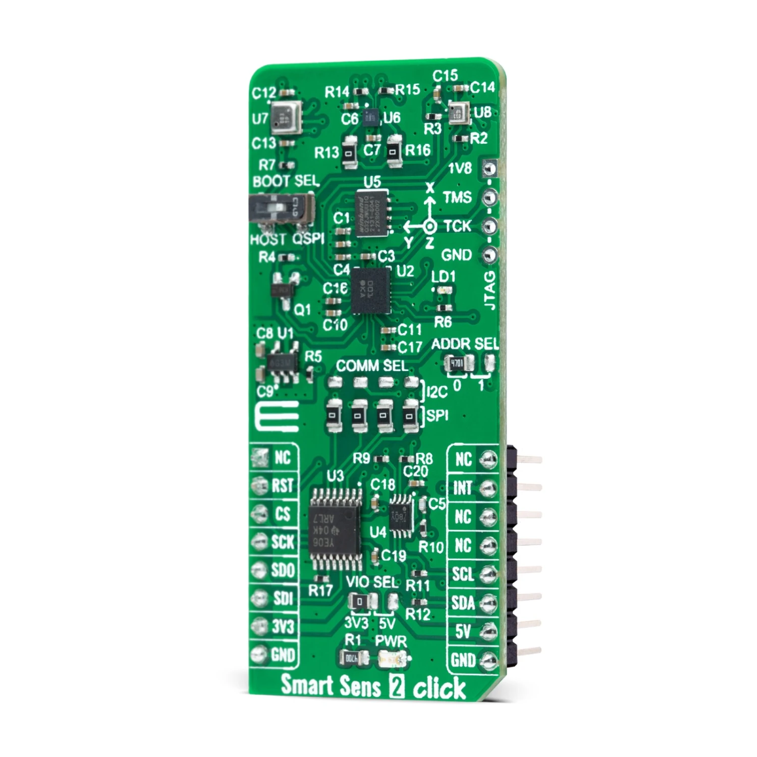 Smart Sens 2 Click is a all-in-one self-learning AI smart sensor solution that contains multiple sensors. This board utilizes the BHI260AP, BME688, BMP390, and BMM150, an ultra-low-power programmable smart sensor, environmental and pressure sensor, and a magnetometer from Bosch Sensortec. The BHI260AP includes a powerful 32-bit MCU and a 6-axis IMU (3-axis accelerometer and 3-axis gyroscope) alongside an event-driven software framework. In addition to its internal functions also perform signal data processing from several onboard sensors performing measurements of various parameters such as an environmental and magnetic field. In addition to these primary functions, this Click board™ allows users to select the desired serial interface, use the debug interface, and select BOOT mode. This Click board™ represents an ideal solution for always-on sensor data processing algorithms at the lowest power consumption.