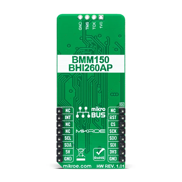 Smart Sens Click is a compact add-on board that contains an smart sensor system with an integrated IMU sensor. This board utilizes the BHI260 and BMM150, an ultra-low-power programmable smart sensor and magnetometer from Bosch Sensortec. The BHI260 includes a programmable and powerful 32-bit MCU, a 6-axis IMU, and a robust software framework. In addition to its internal functions, it also performs signal data processing from the BMM150 that performs measurements of the magnetic field in three perpendicular axes. In addition to these primary functions, this Click board™ allows users to select the desired serial interface, use the debug interface, and select BOOT mode. This Click board™ represents an ideal solution for running always-on sensor data processing algorithms at the lowest power consumption.