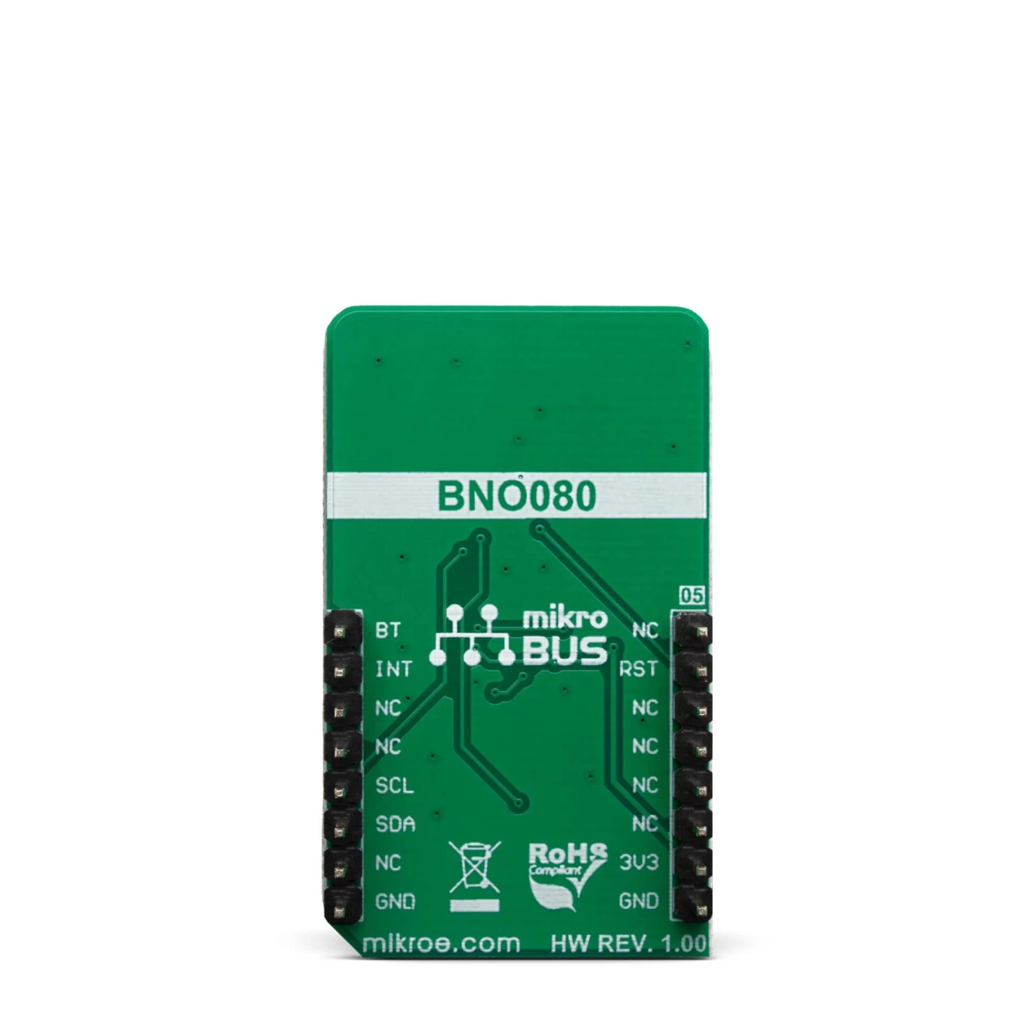 The BNO080 will be started in the Bootloader mode. This mode allows updating the embedded firmware over the I2C interface. When this pin is pulled to a LOW logic level, the device will boot up in the Bootloader mode after the next restart. This pin is routed to the mikroBUS™ PWM pin and it is labeled as BT. The BNO080 datasheet describes the firmware update process in more details.