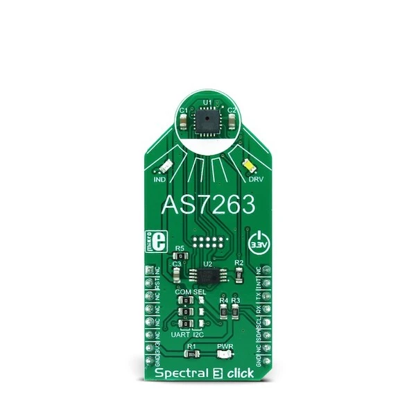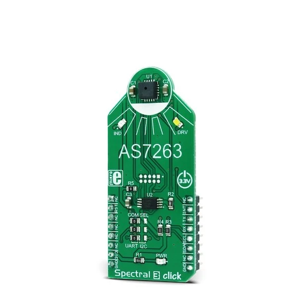 Spectral 3 Click is a multispectral sensing device, which uses the state-of-the-art sensor IC for a very accurate near-IR (NIR) sensing. The sensor on the Spectral 3 Click provides multi-spectral sensing in the NIR wavelengths from approximately 610nm to 860nm with the full width at half maximum (FWHM) of 20nm. Spectral 3 Click provides a direct reading of the six different channels with the 16bit precision, as well as the calibrated reading, that gives 32bit float values with an 8bit biased exponent and a 23bit fraction part, processed through the Spectral ID engine. The sensor also integrates two programmable LED channels with constant current drivers, useful for indication and for providing the backlight for the measured color object.
