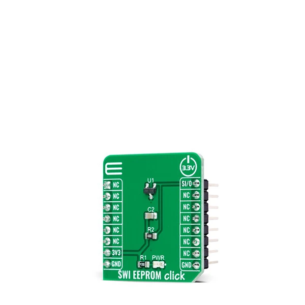 SWI EEPROM Click, as its foundation, uses the AT21CS01, 2-pin serial electrically erasable and programmable read-only memory (EEPROM) that harvests energy from the SI/O pin to power the integrated circuit from Microchip Technology. It provides 1,024 bits organized as 128 words of 8 bits each, a security register with a 64-bit factory programmed serial number, and an extra 16-bytes of user-programmable and permanently lockable storage. It delivers a guaranteed unique serial number for inventory tracking, asset tagging and can always protect the data if needed.