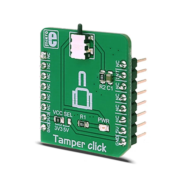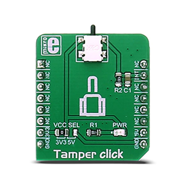 Tamper Click board™ is also additionally equipped with the RC filter that minimizes the bouncing effect, making this Click a reliable solution for any contact detection application.