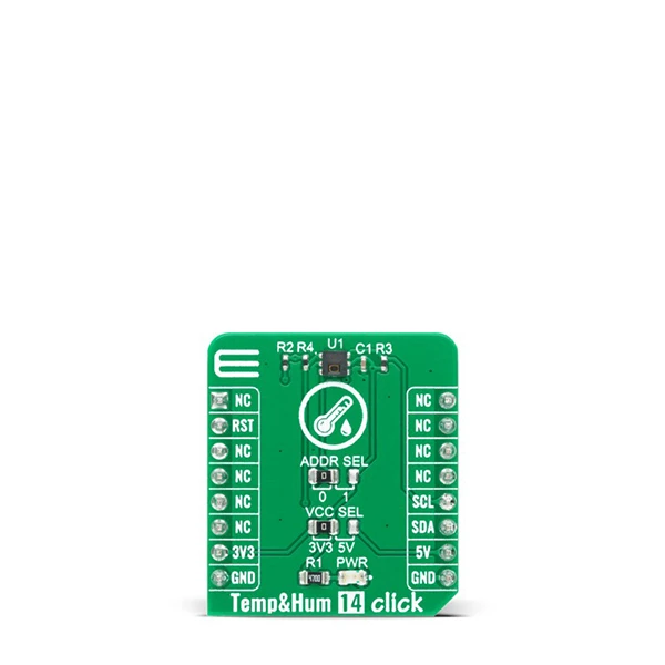 Temp & Hum 14 Click is a compact add-on board that contains one of the smallest and most accurate humidity and temperature sensors on the market. This board features the HTU31D, a highly accurate digital relative humidity sensor with temperature output from TE Connectivity. With power consumption down to 3.78μW and accuracy of ±2%RH and ±0.2°C, this Click board™ provides fast response time, precision measurement, low hysteresis, and sustained performance even when exposed to extreme temperature up to 125°C and humidity environments. This Click board™ is suitable for relative humidity and temperature measuring applications, including weather stations, reliable monitoring systems, and more.