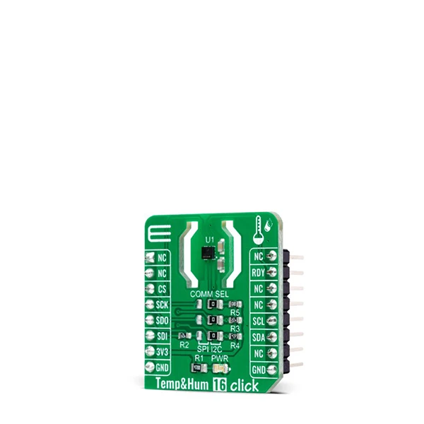 Temp&Hum 16 Click is a compact add-on board that represents temperature and humidity sensing solutions. This board features the WSEN-HIDS (2525020210001), a MEMS-based capacitive humidity sensor with an integrated ASIC and I2C and SPI serial communication from Würth Elektronik. A silicon-based temperature sensor is also integrated within the same package. ASIC contains the multiplier, operational amplifier, analog-to-digital converter, and other signal conditioning blocks like controller logics and interrupts. It converts the analog signal from humidity and temperature sensing elements into 16-bit digital humidity and temperature values. The WSEN-HIDS is factory calibrated for both humidity and temperature measurements with no further calibration required. This Click board™ is an ideal solution to be used in various temperature and humidity-related applications.