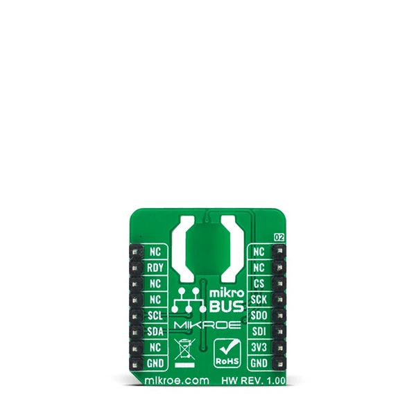 After initializing the sensor, it is recommended to check the availability of data samples using an interrupt signal labeled RDY and routed to the INT pin on the mikroBUS™ socket. By default, after powering up, the sensor goes to power-down mode. In power-down mode, all internal blocks are turned off to minimize power consumption. After selecting one of the two operating modes, the sensor is in an active measurement state depending on the output data rate.