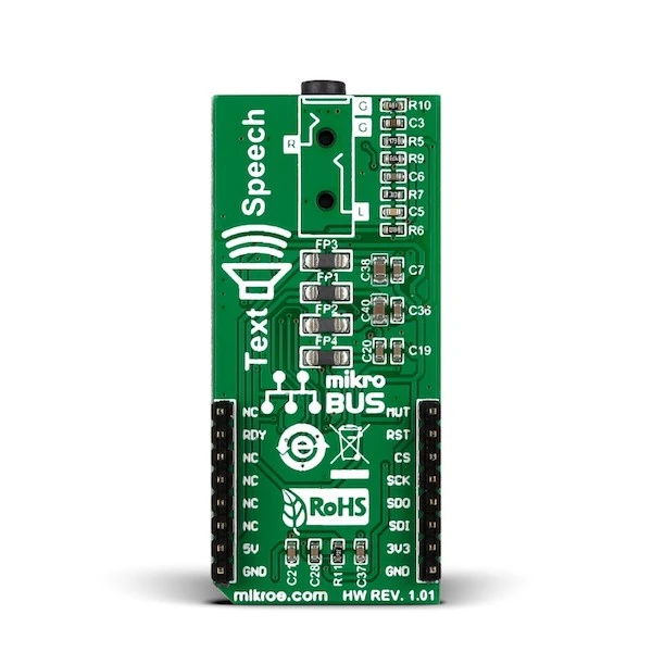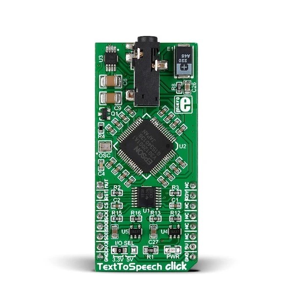 Text To Speech Click is a mikroBUS™ add-on board that carries an Epson S1V30120 speech synthesis IC. The IC is powered by the Fonix DECtalk® v5 speech synthesis engine that can make your robot or portable device talk in US English, Castilian Spanish or Latin American Spanish, in one of nine pre-defined voices. The DECtalk engine includes a parser that gives users fine control over the quality, pitch and intonation of the synthesized speech. The audio is reproduced at 11.025kHz sampling rate. Text To Speech Click board™ communicates with the target board microcontroller through the mikroBUS™ SPI interface (MISO, MOSI, SCK, CS) with additional functionality provided by DRDY, NRST and MUTE pins (in place of default mikroBUS™ INT, RST and AN pins) It can use either a 3.3V or 5V power supply.