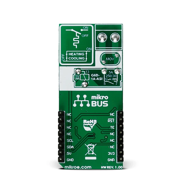 If you need a temperature sensor and relay in one device, you should look no further than Thermostat Click. It can be used to measure environmental temperature and to directly switch ON/OFF cooling and heating devices, performing all the functions of a thermostat.