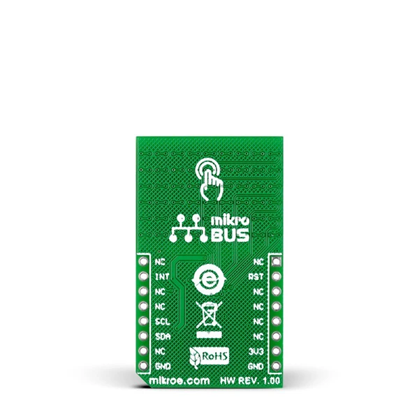 MIKROE Touchpad Click is a capacitive touch input device driven by Microchip’s low-powered MTCH6102 controller. The touchpad surface is covered with a sheet of black plastic to demonstrate the chip’s support for cover layers (up to 3mm for plastic, 5mm for glass) Touchpad Click communicates with the target MCU through the mikroBUS™ I2C interface (SCL and SDA pins), with additional functionality provided by the Interrupt and RSTL pins. Designed to use a 3.3V power supply.