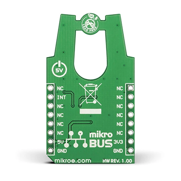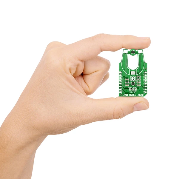 UNI HALL Click is a simple solution for adding an unipolar Hall switch to your design. It carries the Melexis US5881 unipolar Hall-effect switch and a 74LVC1T45 single bit, dual supply translating transceiver. The unipolar Hall effect sensor on UNI HALL Click is sensitive to north pole magnetic fields—when exposed to such a field, it outputs a LOW logic level. Otherwise the output is a HIGH logic level. It can be employed in a wide variety of scenarios—anywhere where a magnet can be used to infer speed, position, or other properties of the target object. UNI HALL Click communicates with the target board through the mikroBUS INT line. It’s designed to use either a 3.3V or a 5V power supply.