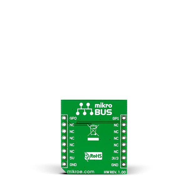 MIKROE Unique ID Click carries DS2401, an enhanced silicon serial number IC. It’s a low cost solution for providing a unique registration number to your design. The chip consists of a factory-lasered 64-bit ROM that includes a uniques a 48-bit serial number, an 8-bit CRC, and an 8-bit family code. It uses 1-wire communications for interfacing with the target board microcontroller, either through a GP1 or GP0 pin (here in place of the default AN and PWM mikroBUS™ pins). The board is designed to use either a 3.3V or 5V power supply.