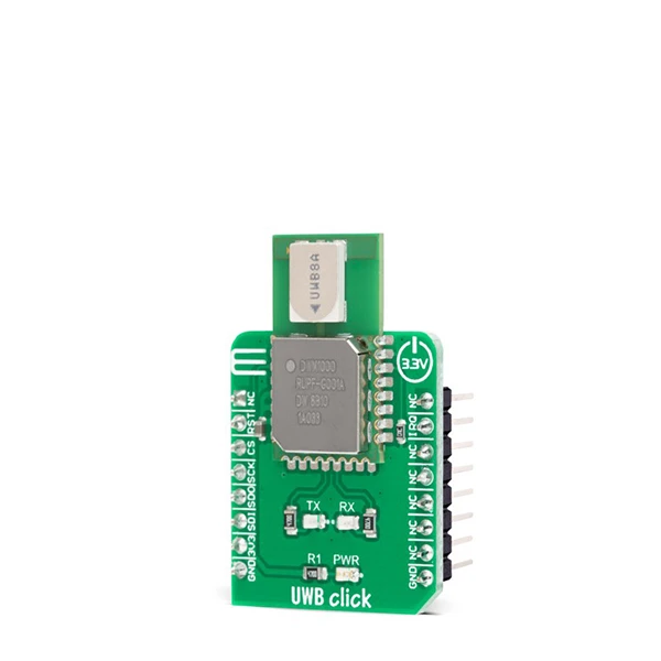 MIKROE UWB Click is an Ultra-Wideband transceiver Click board™ that can be used in 2-way ranging or TDOA location systems to locate assets to a precision of 10 cm and supports data rates of up to 6.8 Mbps. This Click board™ features the DWM1000 module based on Decawave’s DW1000 Ultra-Wideband (UWB) transceiver from Decawave Limited. It features a frequency range from 3.5GHz to 6.5GHz, a very precise location of tagged objects, up to 6.8Mbps data rates, low power consumption, and more while the communication with the MCU is accomplished through a standard SPI serial interface. This Click board™ is optimized for applications in real-time location systems and wireless sensor networks across a variety of markets including agriculture, building control and automation, factory automation, healthcare, safety & security, warehousing & logistics, and a range of others.