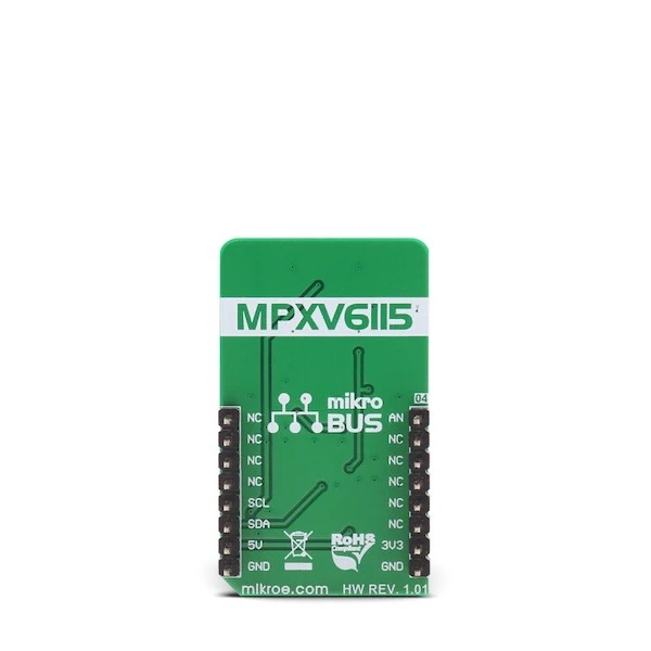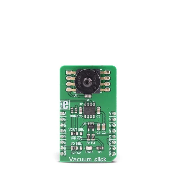 Vacuum Click is an accurate vacuum pressure sensing Click board™, capable of measuring absolute pressure values down to -115kPa. This Click board™ utilizes the MPXV6115V, a very accurate vacuum pressure sensor. This piezo-resistive transducer is a monolithic sensor which combines advanced MEMS manufacturing technology with the on-chip signal processing, offering very accurate readings and very low drift over temperature. The sensor outputs an analog voltage, linearly dependent on the applied vacuum pressure. This voltage is digitized by an accurate A/D converter and delivered over the I2C interface.