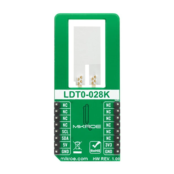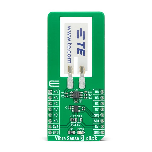 Vibra Sense 2 Click is a compact add-on board that contains a piezo sensor suitable for vibration measurements. This board features the LDT0-028K, a flexible 28 μm thick piezoelectric PVDF polymer film with screen-printed silver ink electrodes, laminated to a 0.125 mm polyester substrate, and fitted with two crimped contacts from TE Connectivity. The sensing element of the LDT0-028K comprises a cantilever beam loaded by an additional mass to offer high sensitivity at low frequencies. Some features of this Click board™ like flexibility, high sensitivity, and performance make it an excellent choice for vibrating sensing applications, security systems, body movement, and many more.