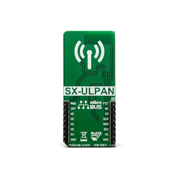 Although the Click board™ uses 5V for the power supply, the SX-ULPAN-SB-2401 module is operated at 3.3V. Having in mind its absolute maximum ratings, it is not advisable to use the Click board™ with MCUs that use logic voltage levels up to 5V.