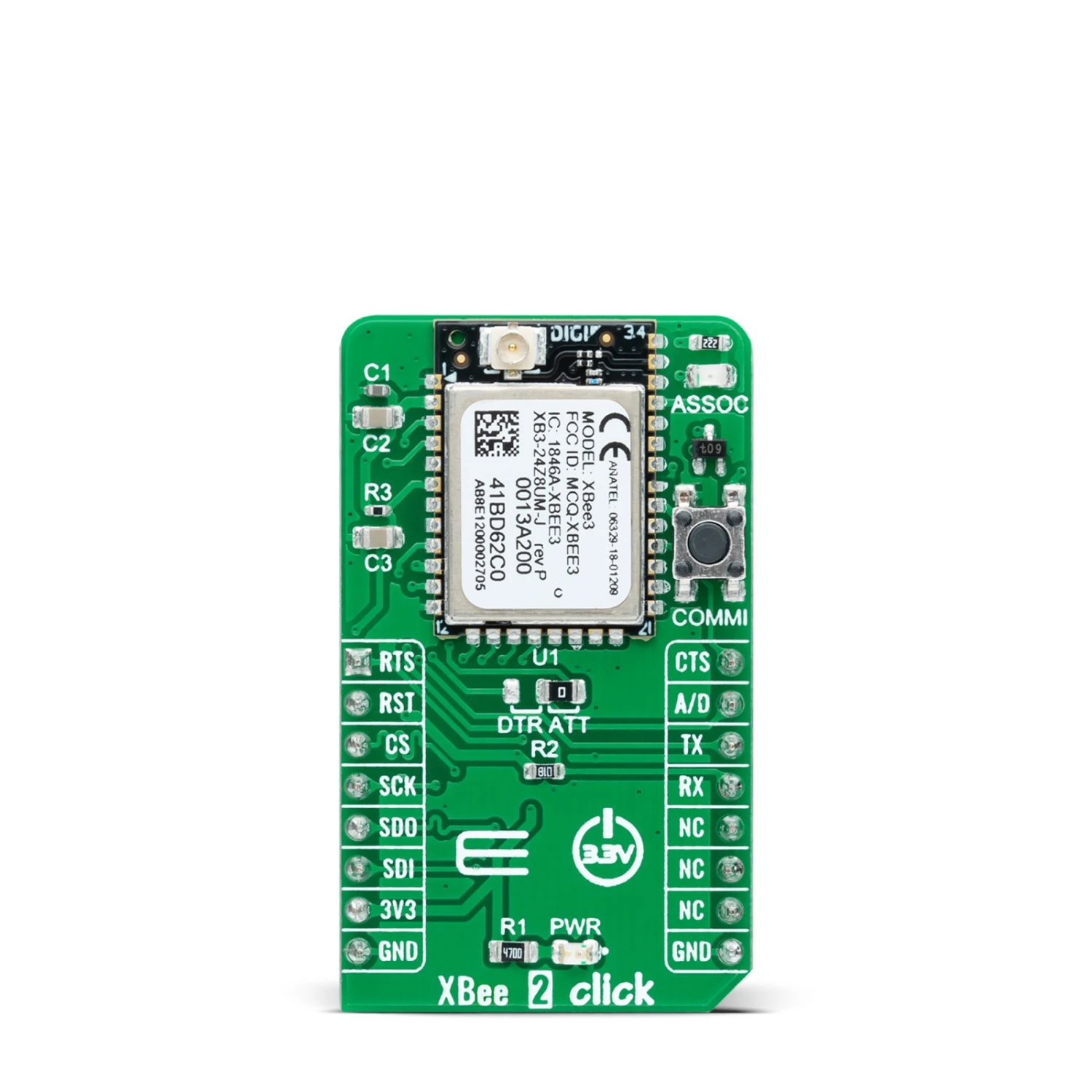 The A/D pin routed on the INT pin of the mikroBUS™ socket represents a type of interrupt whose function can be selected by positioning an onboard SMD jumper to an appropriate position labeled as DTR or ATT. DTR position is a “Data terminal ready” function used to tell the XBee module that the host MCU is ready to communicate, while the ATT position (SPI Attention) represents an indicator for the SPI interface whenever the Xbee module has data for the host MCU. In addition, the board also has a commissioning pushbutton marked as COMMI which, combined with an ASSOC LED, provides various simple functions to aid in deploying devices in a network.