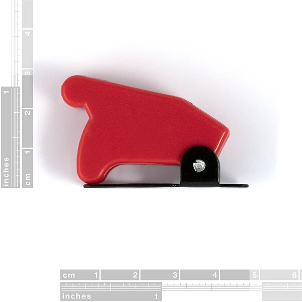 The hot red safety cover protects a toggle switch from accidentally being turned on. When flipped up, the user has full access to a switch underneath. Upon closing the cover, the cover will force the switch arm back into the lower position – a safety mechanism so you can quickly hit the cover down and deactivate the switch.