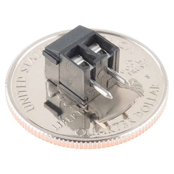 Screw Terminals with 3.5mm pitch pins. Comes in 2, 3, or 4 positions and have the really cool feature of slide-locking together to form any size you need (4, 5, up to 20 without problems). Rated up to 125V @ 10A. Terminal can accept 16 to 26AWG wire. 3.5mm/138mil pin pitch will not fit standard 0.1″ perf boards but this is the most common pitch screw terminal.