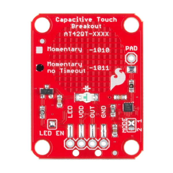 The AT42QT1011 is a dedicated, single-button capacitive sense chip. The chip handles monitoring a conductive area for touch. As long as a touch (e.g., from a finger) is detected, the AT42QT1011 keeps the output line high. Otherwise, the line is kept low. You just need to provide a power source (1.8V–5V) and ground for the AT42QT1011 to work. Additionally, a PAD pin is available if you would like to create your own external electrode.