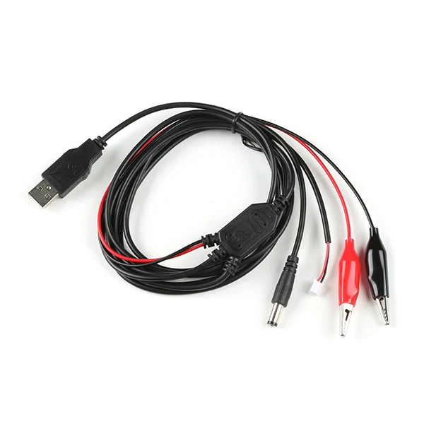 The Hydra brings the 5V and GND lines from your USB power supply, computer or otherwise, and breaks those lines out into three common power connectors: Barrel Plug, JST and Alligator Clips! The clips are shrouded to avoid shorts and the barrel plug is center positive. The cable is 6 feet long overall which give you plenty of room to work.