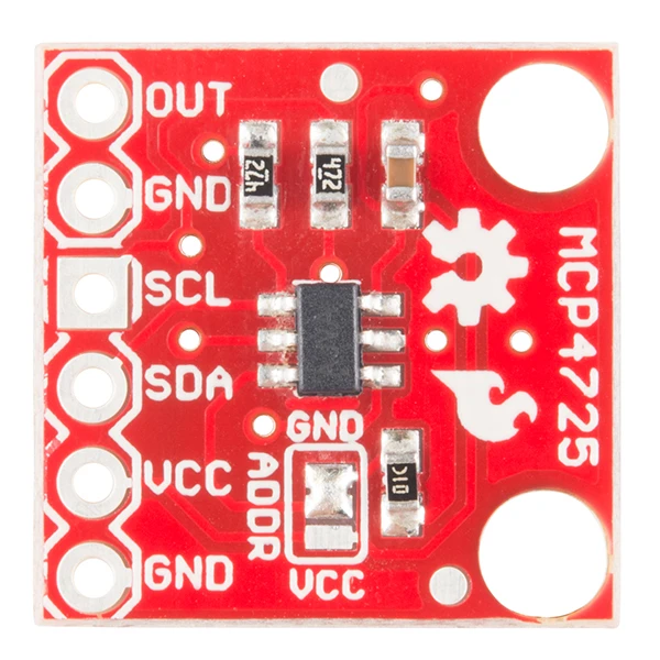 This version of the MCP4725 Breakout fixes a few issues with the board including the IC footprint, the I2C pinout, changes the overall board dimensions to better fit your projects, and a few more minor tweaks. This board breaks out each pin you will need to access and use the MCP4725 including GND and Signal OUT pins for connecting to an oscilloscope or any other device you need to hook up to the board. Also on board are SCL, SDA, VCC, and another GND for your basic I2C pinout. Additionally, if you are looking to have more than one MCP4725 on a bus, the pull-up resistors on this board can be disabled just check the Hookup Guide in the Documents section below for instructions and tips on doing this.