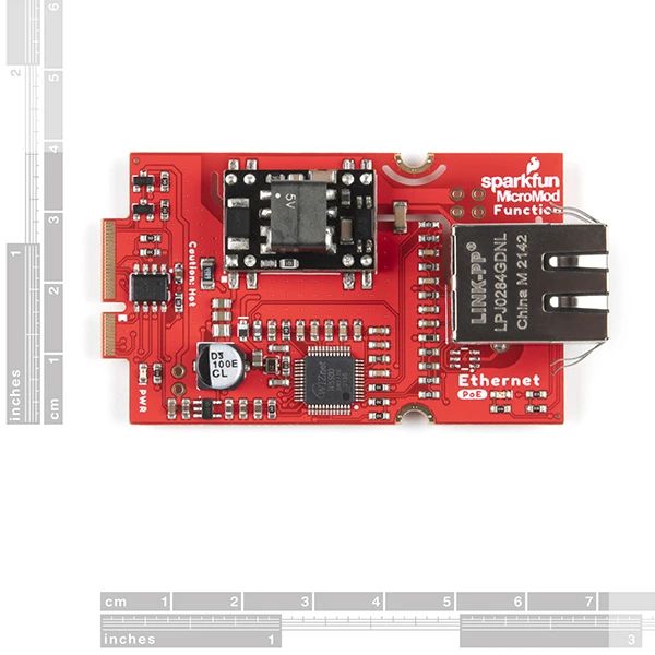 Integrate your MicroMod project into an Ethernet network including Power-over-Ethernet with the SparkFun MicroMod Ethernet Function Board. This specialized Function Board uses the W5500 Ethernet control module from WIZnet and a DC/DC converter to configure a MicroMod assembly as a connected and powered device into an Ethernet network with a Power-over-Ethernet (PoE) system.