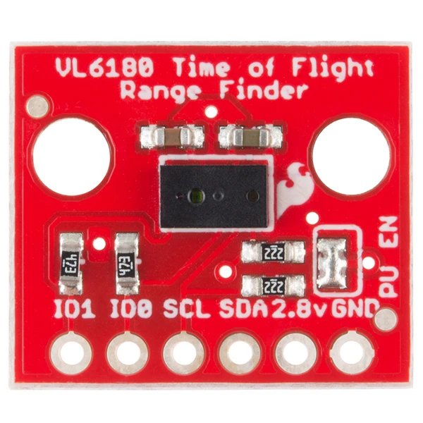 This breakout for the VL6180 from STMicroelectronics is as simple as it gets. Only the required passives are populated to give you the smallest, most cost effective way to use multiple sensors in a project with an I2C interface. The VL6180 is actually a 3-in-1 package that combines an IR emitter, a range sensor, and an ambient light sensor together for you to easily use. We’ve broken out each pin that is required to use the VL6180, including: IO1, IO0, SCL, SDA, 2.8V, and GND. Please be sure to note, however, the ToF Range Finder Breakout only accepts 2.8V input and logic. You must provide a 2.8V voltage source and level shifting to 3.3V and 5V devices.
