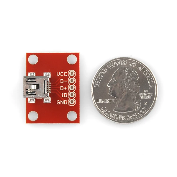 This new version now has all 5 pins broken out on the connector. We have no idea what USB device you are hooking up to, but if you need to add a miniUSB/USB Mini-B connector to your breadboard – here it is. Also good for an un-regulated, non-limited 5V supply up to 100mA.