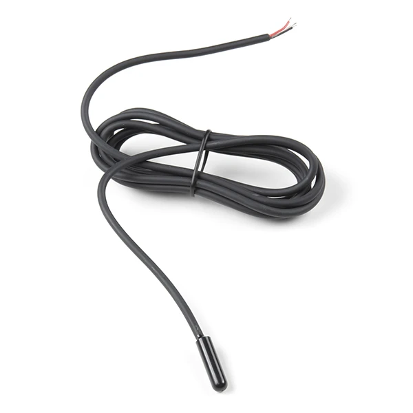 This sealed digital temperature probe lets you precisely measure temperatures in wet environments with a simple 1-Wire interface. The DS18B20 provides 9 to 12-bit (configurable) temperature readings over a 1-Wire interface, so that only one wire (and ground) needs to be connected from a central microprocessor. Power for reading, writing, and performing temperature conversions can be derived from the data line itself with no need for an external power source.