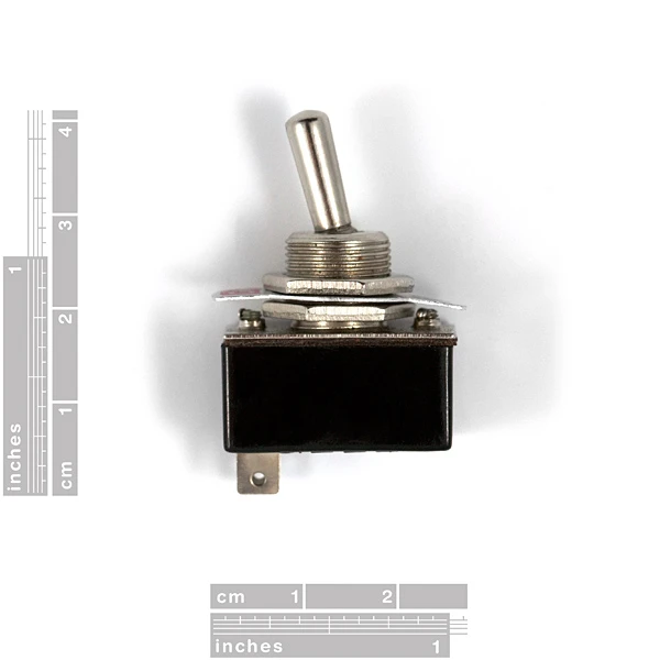 This is a heavy duty SPST toggle switch – your basic on/off toggle. Rated for 2A at 250V or 4A at 125V. Includes a face plate and two threaded nuts for mounting. Works great with our missile switch cover.