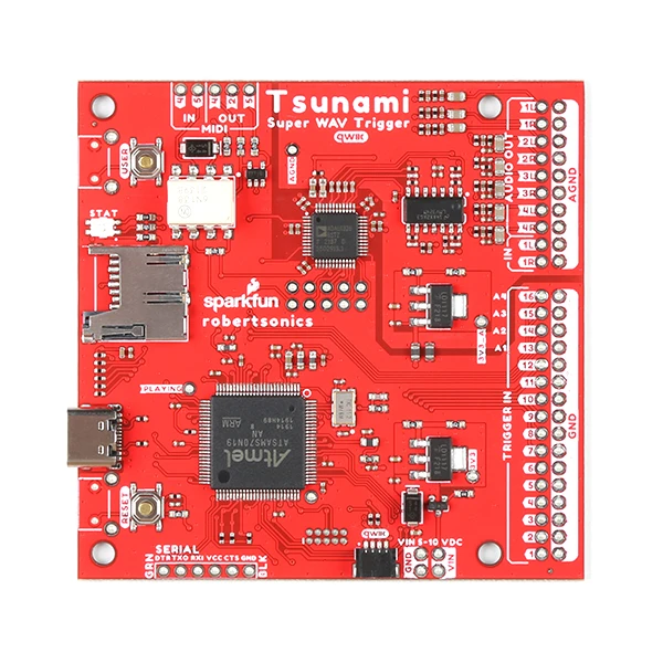 1 Note: The original Tsunami Super WAV Trigger (Qwiic) supports 32 mono or 18 stereo tracks independently and simultaneously, but is facing supply chain constraints. If 25/13 voices is enough for your project, you have come to the right board!