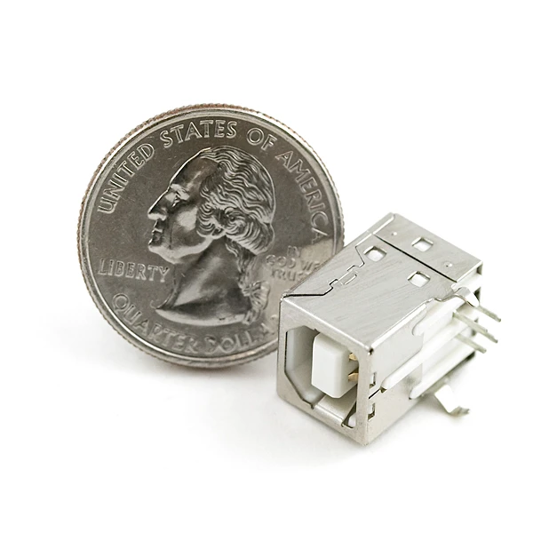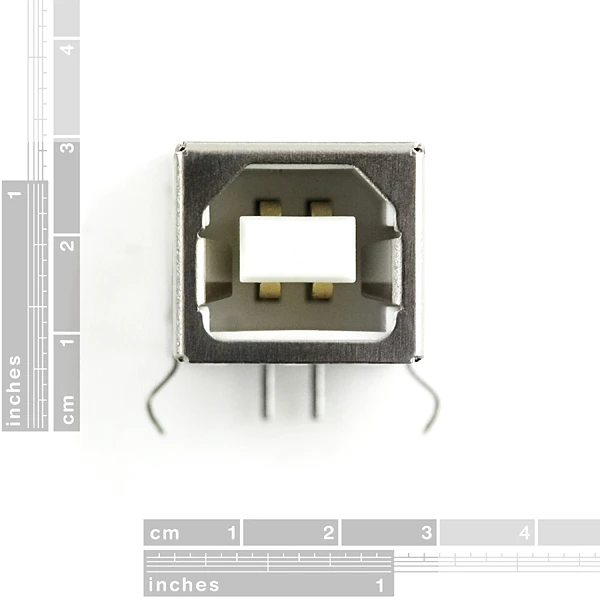USB Type ‘B’ Female connector. The 4 connection pins have .1″ spacing allowing it to be inserted into development boards and perf boards with mild modification. You can either drill two 80mil holes for the support posts, or cut them off completely.