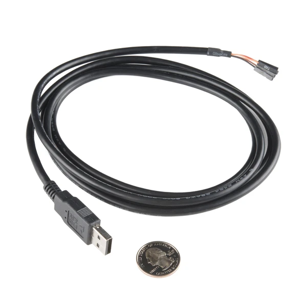 The FTDI cable is designed around an FT232, which is housed in a USB-A connector. The other side of the cable is terminated with a separated 4-pin connector with the following pinout: RX (Yellow), TX (Orange), VCC (3.3V) (Red), and GND (Black). A link to the FTDI drivers can be found in the Documents section below.