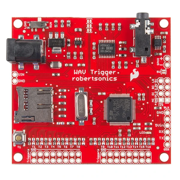 The WAV Trigger is a unique high-fidelity polyphonic audio player with surprising capabilities. Supporting up to 2048 uncompressed 16-bit, 44.1kHz wav files – the same quality as an audio CD – the WAV Trigger can play and mix up to 14 stereo tracks simultaneously and independently, with very low latency. Tracks can be controlled via 16 programmable trigger inputs, or by using a native serial control protocol or even MIDI.